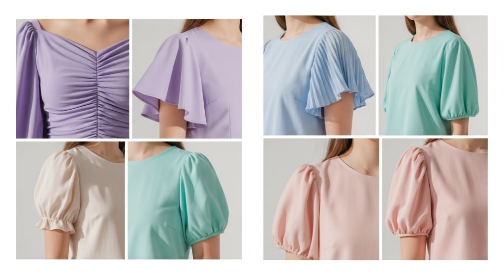 - Flared or bell sleeves add motion and softness to the arms. They draw attention away from wider upper arms or muscular builds.