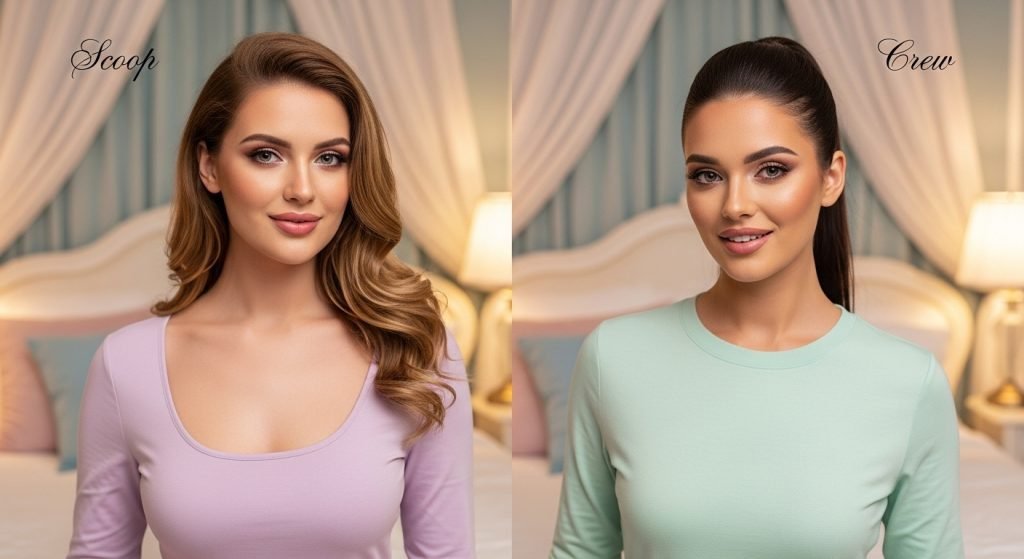 - Crew necks: These flatten and shorten the neckline, making everything look boxy.