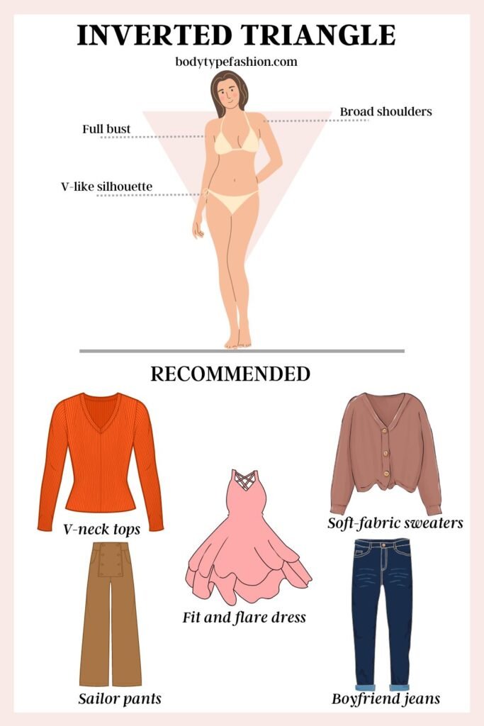 If you have an inverted triangle body shape, you have broader shoulders and a narrower waist and hips. The goal is to balance your proportions.
